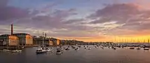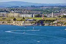 The city is located at the south-west corner of Devon, with Cornwall beginning immediately to the west of the city. It lies between two river mouths - the estuary of the River Tamar ("TAY-mar") to the west (the estuary is called the Hamoaze) and the estuary of the River Plym to the east (called the Cattewater). To the south is Plymouth Sound (everyone just calls it "the Sound"), a large bay bounded to the west by the Rame Peninsula which is now part of Cornwall, and to the east by the Mount Batten Peninsula. This produces one of the world's most impressive natural harbours, in which you'll see innumerable yachts, sailing ships, kayaks, other pleasure craft, and even small fishing vessels (of which there are a reasonable number in Plymouth). The Sound is protected from the sea by a huge breakwater at its southern end, easily seen from the shore. You'll often see naval vessels around it.