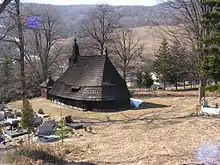 - 🌍 John-Baptista church at Kalná Roztoka (Chrám sv. Jána Krstiteľa), Kalná. The Church of St. John the Baptist, a Greek Catholic wooden church from the late eighteenth century and renovated in 1834. The special feature of the building is that it was covered with hot pitch then allowed to cool and harden. This type of coating is applied to churches using with wood of lesser value for example, birch. The interior is divided into three parts. The narthex surmounted by a tower is relatively impressive. The polygonal apse behind the centre and interior walls, visually plastered has the effect of expanding the interior. The sanctuary boasts almost complete iconostasis with a beautiful icon of the Mother of God (Hodigitria "She who shows the way"). Notice the beautiful door with panels depicting the patriarchs. The iconostasis dates from the late eighteenth century.