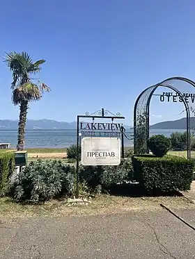 - 🌍 Lakeview Hotel and Resort (Oteševo), ☏ +389 47 551 195. This hotel has a private beach and one of the best views of the lake. It has a lot of amenities and seems to offer new things every summer. It also contains a nice restaurant. The popular Macedonian television series Prespav is set (but not filmed) here.