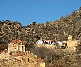 - 🌍 Treskavec Monastery (Манастир Трескавец) (The road to the monastery has been paved and is suitable for cars/taxis. Alternatively, one can hike about 6km/3.6mi from Varoš village. This hike is strenuous but brings one through spectacular scenery with expansive views of the plains below.). Built in the 12th century and set atop an outcropping of rock on Zlato Mountain, this monastery dedicated to the Holy Mother of God is renowned as a place with an incredibly beautiful Macedonian sunset. Prior to the construction of a paved road in the 2010s, Treskavec was known for being largely inaccessible but nonetheless still being home to one monk. A fire in 2013 did a lot of damage to the monastery grounds, destroying almost everything but the church. The surviving frescoes inside are from different periods in the 14th, 15th, 16th and 19th century. It is no longer possible to spend the night here as the monks' and visitors' quarters were destroyed in the fire. If you hike in summer start early, if you want to take the hike in winter, early spring or late fall, ask around to make sure the path is passable. The position of the monastery offers views below of Prilep and above of the higher distant surrounding mountains.