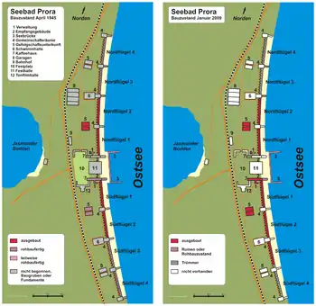 Prora is a site on the German Baltic Sea island of Rügen. During the Nazi era the worker's organization Kraft durch Freude (Strength through Joy) began building a huge beach resort hotel for 20,000 people at the shore of the Baltic Sea. The project was almost finished when World War II started, but it was never used as a hotel. In the East German era the site was used as a military base.