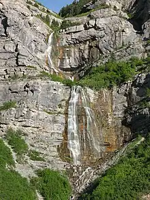 - π Bridal Veil Falls (2.5 mi (4.0 km) north on Highway 89 up Provo Canyon). 607 ft (185 m) waterfall in Provo Canyon that is popular with cyclers and hikers. The waterfall is viewable from the road and a viewing station. A short bike/walking trail leads to the bottom of the falls. The middle level of the falls can be reached via a short but steep trail.