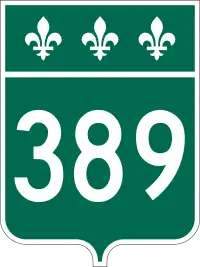Quebec Route 389 is in eastern Quebec. It runs north from Baie-Comeau to Fermont in Caniapiscau, Quebec, continuing as the Trans-Labrador Highway through Labrador City. Route 389 (R-389) is a challenging/fun road to drive. The road alternates between sections of asphalt and gravel. In places it is narrow and twisty. There are few services. You often have to share the road with lumber trucks that travel quickly when they are heading north empty.