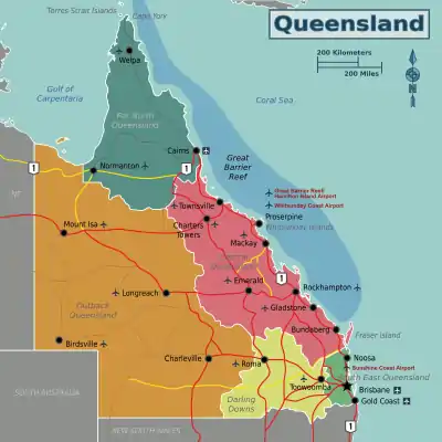 Queensland (pronounced KWEENZ-land) is the northeastern state of Australia, famous for natural wonders, such as the Great Barrier Reef, the Daintree Rainforest or Fraser Island. With just over a 5 million inhabitants, most of them in the southeast, in or around the capital Brisbane and the Gold Coast resort city, much of the state is uninhabited, or very sparsely populated.