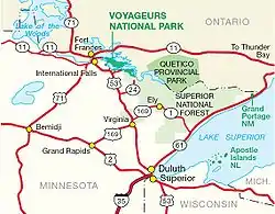 It is known for its excellent canoeing and fishing. This 4,760-km² (1,180,000-acre) park shares its southern border with Minnesota's Boundary Waters Canoe Area Wilderness, which is part of the larger Superior National Forest. These large wilderness parks are often collectively referred to as the Boundary Waters or the Quetico-Superior Country.