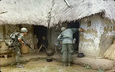 American soldiers searching for Viet Cong in a home in the Quy Nhơn countryside, 1966. The "pacification" operations led to over 130,000 locals fleeing for shelter in refugee camps.