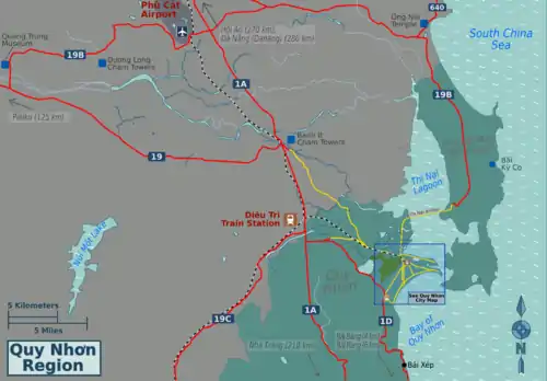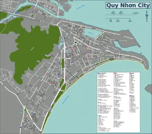 The centre of Quy Nhơn lies on a small peninsula which juts out like a dragon's head from the mainland into the South China Sea. Trần Hưng Đạo street is the most convenient road running east to west, stretching from the far eastern tip through the city centre to connect to Highway 1A and the train station, airport and Bình Định countryside in the northwest. Most sites of interest to tourists are to the south of Trần Hưng Đạo; to the north are residential areas, fishing-related industries and industrial port zones.