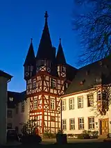 • 🌍 Adlerturm (Eagle Tower). This late Gothic corner tower was built in the 15th century as part of the old city wall. It is 20.5 m high and has an inner diameter of 5 m. The walls are 1 m thick. One of the four floors contains a dungeon which is only accessible through a hole in the vault. The tower used to stand directly on the Rhine. In the last century it was home to an inn called "Zum Adler", from which the tower took its name. Johann Wolfgang von Goethe lived here when he visited Rüdesheim, admiring the magnificent view of the river. Today the Adlerturm is owned by a bank.