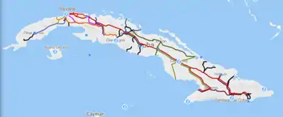 The main train line in the country runs between Havana and Santiago de Cuba, with major stops at Santa Clara and Camagüey. Trains also run to other cities such as Cienfuegos, Manzanillo, Morón, Sancti Spiritus, and Pinar del Rio.