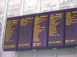 - East Coast Main Line - from London King's Cross to Edinburgh Waverley via Peterborough, York and Newcastle, with a branch to Leeds. Services run at least hourly from London to Newark-on-Trent, Leeds, and Edinburgh, with less frequent services to Bradford, Hull, Sunderland and Aberdeen.