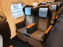 Most trains operating on the bullet train networks of eastern Japan and Hokkaido (those operated by JR East and JR Hokkaido) offer a premium Green Class experience known as GranClass (グランクラス guran-kurasu). The service can be equated to international business class on an airline and features 18 wide, power-reclining "shell seats" in a 2+1 configuration.
