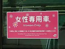 To provide a sense of safety and security for female passengers, many of the JR and private commuter rail lines in Japan reserve a car for women only during the morning and evening rush hour. These cars are identified by special placards and stickers on the train and platform, which also designate the times that women-only cars are in effect. Also, some limited express trains operated by JR West to and from the Kansai region have reserved seats specifically for women and their children. You will find men sitting in "women-only" seats, but they will make way if requested to do so. Normally, the first and last carriages are designated "women-only" during the morning rush time.