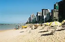 - 🌍 Boa Viagem Beach (Praia de Boa Viagem). Probably one of the world's best urban beaches, with pristine white sands. With 8 km of hotels and restaurants, it is the longest urbanized stretch of beach in Brazil. If you want a tan, you came to the right place. The beach road has a wide walkway attached and this is dotted with huts selling food and drink. Try the traditional "água de coco" (coconut water). The beach itself is full of vendors selling food and drink. There are also vendors selling t-shirts, hats, suncream, sunglasses. These guys can get a bit insistent. Simply smile and one word will have them on their way: não (pronounced "now.") The beach is somewhat protected by a coral reef wall visible at low tide, making it good for a swim, but don't go out past the wall, as the waters are more dangerous, with sharks reported in the area.