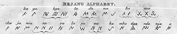 Rejang language has its own native writing system called Buak Jang ꤷꥈꥁꤰ꥓ꤺꥏ (literally means 'Rejang script'), it is the native script commonly used by Rejang people for Rejang language, but these script also used as the writing system for its neighbouring ethnic languages as well, such as Serawai and Mukomuko. Though still used in native documents, and sometimes seen side by side with Latin script in street signs and the names of public buildings, it has been almost totally replaced by the Latin alphabet. A traveller will almost never have to read Rejang script to get information. Makes an awesome tattoo, though.