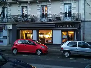 - Racines, 4 Passage Antoinette Caillot (100 m east of IMA, bus C5,C6,9), ☏ +33 2 9965 6421. Tu–F 12:00-14:30, 19:45-21:00, Sa 19:45-21:00. Rave reviews for this restaurant (Michelin 1-star), where the chef is Virginie Giboire.