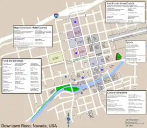 - The "Riverwalk" area. The North end of Reno's Riverwalk District meanders along Reno 's beautiful Truckee River. Most of the retail activity on this end is situated along First Street between Lake St. (east) and Arlington St. (west). This end of the district has galleries, coffee shops, great dining including a brewery and a French restaurant and even a movie theater. Reno 's renowned Truckee River Whitewater Park runs directly through this area offering visitors even more adventurous outdoor activities in the urban setting of downtown Reno. Kayak and raft rentals from Tahoe Whitewater Tours (☏ +1-800-442-7238) are available at Wingfield Park, located at the 1st and Arlington Street area.