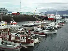 • 🌍 Fish Company (Fiskifélagið), Vesturgata 2a (across the street from the tourist information centre), +354 552 5300, . In the basement of a renovated old timber house standing in the original harbour of Reykjavík. 5,000-6,000 kr.