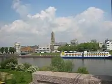 - Rhine–Meuse–Scheldt delta (km 867–1033) – Behind the German–Dutch border, the Rhine splits into dozens of branches, forming a vast delta that covers much of the Netherlands. The Meuse, that used to be an independent river with its own estuary, became a tributary of the Rhine in 1970 due to the construction of the Delta Works. Confusingly, two of the Rhine's main estuaries are called "Old Meuse" and "New Meuse".