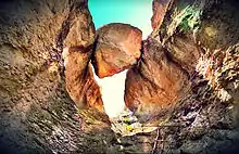 - ๐ Karadzhov-Stone. (Karadzhov Kamak) is an interesting rock phenomenon near the village Mostovo. On a high plateau (1,448 m), a gaping fugue has formed on its vertical walls, in which a huge stone is stuck, as if displaced by higher forces there. Since antiquity, this place has been something special for the people - the ancient Thracians built a sanctuary here in which they honored their dead. To this day, small pits cut into the rock for religious purposes have been preserved, as well as steps leading to the upper part of the massif.
