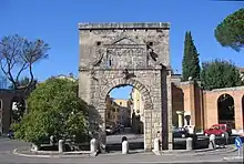 - π Porta Romana, Piazza della Repubblica. The southern city gate of the mediaeval city walls, into the Via Salaria consular road to Rome. The current gate was built in 1586 and enclosed the small street Via Porta Romana; in 1930 it was moved at the center of the square to make its appearance more spectacular, as if it was an arch of triumph. Atop the gate, an inscription greets who is entering the city in Latin Ingredere Omnia Fausta Ferens ("enter bringing good wishes"); another salutes who is exiting the city with I et red feliciter ("go and come back successfully").