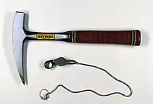Most rockhounds carry a geologist's hammer which has a point on one side, useful for prying interesting things out of the rock they are found in. Many also carry a loupe, a tiny magnifying glass used mainly for examining gems.