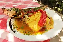 Other dishes include a burger bun with a slice of ham, a slice of cheese and a layer of French fries, ciorbă de burtă (white sour tripe soup), ciorbă rădăuțeană (very similar to ciorbă de burtă, but with chicken instead of tripe), ciorbă țărănească (a red sour soup, akin to borș but with the beet root being replaced by fermented wheat bran, with lots of vegetables), Dobrogean or Bulgarian salads (a mix of onions, lettuce, tomatoes, cheese, white sauce and ham), onion salad - diced onion served in a dish, tomato salad - diced tomato with cheese, șorici (pig skin - boiled and sometimes in stew), and drob (haggies) - a casserole made from lamb or pork liver and kidneys. Local eclectic dishes include cow tongue, sheep brain (Easter), caviar, chicken and pork liver, pickled green tomatoes and pickled watermelon.