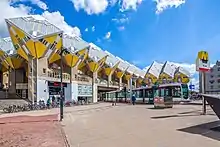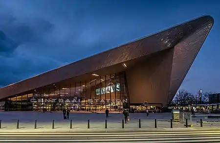 - π Station Rotterdam Blaak. The area around the station was destroyed by a Nazi bombardment during World War II, forcing the Netherlands to surrender. After the war this area was populated with some bold examples of modern architecture.