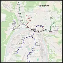 The Métro du Rouen is a tramway operating in Rouen, running north to south from Boulingrin in the north to Saint-Sever, where it branches off into two lines - one to Technopôle and one to Georges Braque.