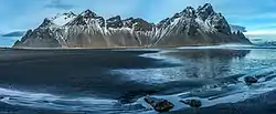 - Attempt a detour just before the tunnel from Höfn get to Stokkness, where you get to see Vestrahorn, perhaps the most photographed mountain of Iceland. If lucky or skilled with photography techniques, the mountain is reflected onto the water. Unfortunately, it is one of the few places where you have to pay to see nature (kr 800 per person to be exact). Perhaps as a consolation, you can also check out its very own Cafe and a Viking village film set that never took off. To the right of Vestrahorn is Bunnhorn, also called the Batman Mountain because of its shape with three peaks that look like Batman’s logo.