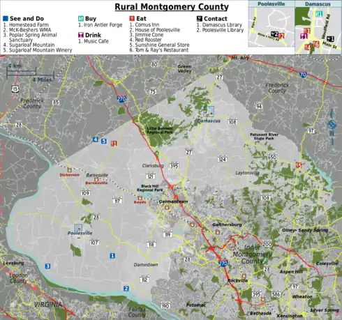Rural Montgomery County, Maryland, is a fairly oddball choice for a trip, as people generally don't think to visit the countryside so close to the metropolis just southeast. It gets a fair amount of visitor traffic nonetheless, simply because it is so easy for residents of the close-in Montgomery County D.C. suburbs to get to. In particular, Sugarloaf Mountain is a very popular destination. But if you look a bit further and feel like wandering along quiet country roads, there are other gems to explore, be they farms where you can go picking, petting zoos, wineries, or even Maryland fried chicken.