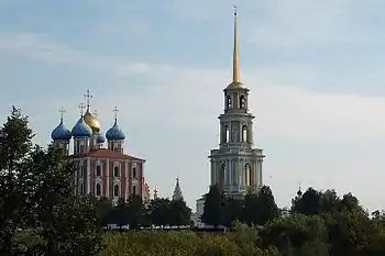 - Kremlin of Ryazan. The city's major architectural attraction with a number of old churches and a very beautiful cathedral. Kremlin is located at a high river bank, and you can enjoy an amazing view from it. The city center here changes into the rural floodplain of the Oka river. There are several museums and exhibitions inside the kremlin, you can also buy local souvenirs there. free access to the territory, charge for the entrance to museum exhibitions.