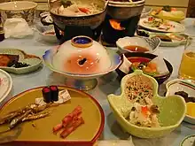 Once you have bathed, dinner will be served, either in your own room or in a dining room. Ryokan typically serve kaiseki cuisine, traditional meals that consist of a dozen or more small dishes. Kaiseki is very elaborately prepared and presented from carefully chosen seasonal ingredients. There is usually a simmered dish and a grilled dish, which you cook individually, as well as obscure items that most Westerners aren't usually familiar with; by all means ask if you are not sure how to eat a given item. Local ingredients and dishes are also showcased, sometimes replacing the kaiseki experience with oddities such as basashi (horse meat) or a meal cooked in an irori hearth. The food in a good ryokan is a substantial part of the experience (and the bill), and is an excellent way to try some high-class Japanese cuisine.