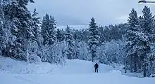 Saariselkä (Sámi: Suoločielgi) is a largish winter sports centre in the municipality of Inari high up in Finnish Lapland, some 250 km north of the Arctic Circle and nearly 1000 km away from the southern capital Helsinki.