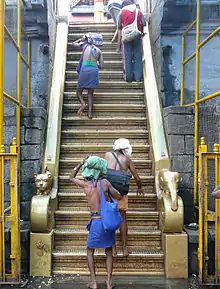 The temple is situated on a hilltop at an altitude of 468 m above mean sea level, and is surrounded by mountains and dense forests. Temples exist in each of the hills surrounding Sabarimala. While functional and intact temples exist at many places in the surrounding areas like Nilackal, Kalaketi, and Karimala, remnants of old temples survive to this day on remaining hills. Devotees must climb the mountains range to reach the temple. For this, pilgrims trek 4.5 km route into dense forest path, leaving all vehicles at Nilakkal parking station. For handicapped pilgrims, doli service (palanquins) are available. The main temple is better known as Sannidhanam (Sacred Abode), constructed on top of a raised platform. 18 golden steps lead to temple shrine, each step considered sacred with reference to each Hindu Veda and other scriptures. 2 temples are located at ground floor, one dedicated to Lord Ganesh and another for Goddess. A giant fire pit is situated on left side 18 golden steps, where devotees need to burn their coconuts as a token burning their sins.