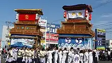 - Komatsu, Tanbara, and Toyo Autumn Festivals - There are many other autumn festivals that one can catch with proper planning in the areas of Komatsu, Tanbara and Toyo. Komatsu's festival usually starts later than Saijo's. On the first night, the danjiri congregate at Komatsu Elementary School to show off their strength as those carrying them shout, "Sorya!". Then they are carried in a procession for many kilometers along old roads between harvested rice fields. Often a local child is beating a taiko drum inside as the danjiri-bearers sing old songs. It is recommended that you tag along. On the final night the Danjiri move from their home areas and gather at Mishima Shrine, located atop a mysterious kofun.