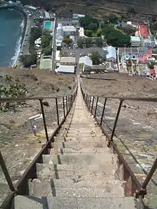• 🌍 Jacob's Ladder. A staircase that rises from Jamestown to Ladder Hill Fort high above. It is said to have 699 steps. The "Ladder" was built in 1829 as an inclined plane to help Jamestown haul ammunition up to the post on Ladder Hill. Then it was used to bring goods down from the farming areas in the centre of the island, and manure up out of town. The planes are on either side of the steps, and the cart on one side was used to counterweight the cart on the other. The Ladder is a prodigious climb at over 900 ft (270 m) long, with a vertical drop of about 600 ft (180 m) and with a slope in places of about 45 degrees and very few tourists can climb it in one go. In addition to its length, its stairs are somewhat high, making the climb all the more difficult. There are railings, but no landings for the entire length, and those who are afraid of heights may not want to look down. If you see a child, you might want to ask them to show you how to slide down the railings; they manage this scary feat without killing themselves. The Ladder is lit at night.