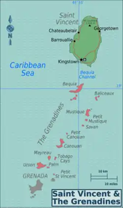 | Grenadines an archipelago of 32 islands and cays, to the south |