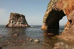 - Moneron Island (Остров Монерон), known in Japanese as Kaibato (海馬島). A small unpopulated island southwest of Kholmsk, popular with divers, snorkellers, and bird watchers. It's Russia's first marine park, owing its existence to an array of underwater reliefs and the warm Tsusimskoye current that ensues an abundance of underwater wildlife, even subtropical species, and some fantastic plants. Although poaching is an increasing problem for this natural environment, it's still well worth a visit, and often has 30-40 meters of visibility. Above the water the scenery is quite enchanting with dramatic rock formations, waterfalls, rocky canyons and alpine meadows. The island has numerous bird colonies and is a breeding ground for sea lions. Access requires a chartered boat, which usually leaves from Nevelsk, 50 km south of Kholmsk. Sakhalin Diving in Yuzhno-Sakhalinsk can help with arrangements to dive here, and the State Park Agency opened a new tourist facility on the island in 2009.