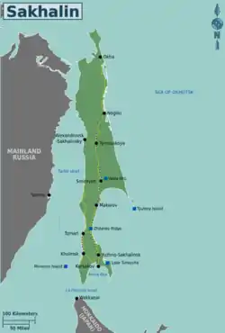 Sakhalin (Russian: Сахали́н, suh-khah-LEEN), formerly known as Karafuto (樺太, kah-rah-foo-toh) to the Japanese, is a large and very sparsely populated island which was the center of a long power struggle between Russia and Japan for control of its large oil and gas resources. Sakhalin is beautiful, but has an undeveloped tourist sector. However, because of the energy business, good food and hotels catering to foreigners are available.
