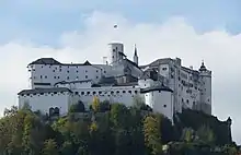 - 🌍 Hohensalzburg Fortress (Festung), Mönchsberg 34, ☏ +43 662 84 24 30 11, fax: +43 662 842430-20, office@festung-hohensalzburg.at. 09:30 - 17:00 daily. On top of a mountain, the Festung offers breathtaking views of Salzburg and the Alps. One area of the fortress offers visitors the chance to look down on a field below to find only one house, the executioner's residence. It was believed to live anywhere near the executioner was bad luck. Inside the fortress is a museum of medieval weapons, life on the fortress, and torture instruments. Public concerts are often held here in the evenings, reservations are recommended. On nights with concerts, it is possible to remain within the walls past dark. To avoid the vertical hike up to the fortress, a funicular is available to ride, for a fee. Adults: €13.20 (funicular) €11.70 (foot), children (6-15 years): €7.50/€6.70, family ticket: €29.20/€26.