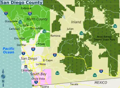 | Inland East of San Diego lies a mountainous region of high desert that's strikingly rural for its proximity to such a large city. Out here visitors will find desert scenery, arid backcountry, forested towns, charming small towns, several casinos operated by local Indian tribes scattered throughout the area, and wine growing regions like the town of Julian. |