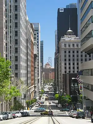 Union Square-Financial District is an area of Downtown San Francisco, made up of two neighborhoods: the bustling shopping and theater district surrounding Union Square, and the central business district where Market Street meets the bay. This is where you will find many of the city's office buildings, luxury hotels, and department stores, where tourists riding in on cable cars and streetcars cross paths with the weekday commuters who come in through the Market Street Subway. The area is bounded roughly by Market Street to the south, the San Francisco Bay to the east, Chinatown and Taylor Street to the west, and Bush Street (between Taylor and Kearny) and Washington Street (between Kearny and the bay) to the north.
