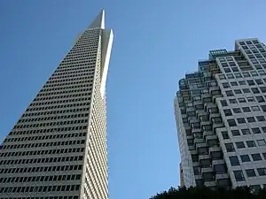 - π Transamerica Pyramid, Montgomery and Washington. San Francisco's tallest and most famous skyscraper, controversial when it opened, but now accepted. There used to be an unusual observation deck on the ground floor with 4 big TV monitors, showing live views of the city transmitted from cameras at the top of the building. They now have a happy worker at the bottom that tells you anything and everything you want to know about San Francisco and has some great stories. Then he tells you that they no longer have the 4 big TVs and are building a restaurant where you can view the city from inside.