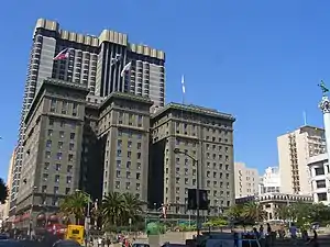 - π Westin-St Francis Hotel, 335 Powell St (west side of Union Square, between Post and Geary), β +1-415-397-7000. Now a member of the Westin chain, this is an iconic San Francisco hotel. The lavish lobby and cafe area are used as a meeting place by quite a lot of people who aren't guests there, despite the pricey lattes and ritzy atmosphere. In a peculiar bit of design, the lobby has a side entrance to the Harry & David store, should you need to pop over for a few chocolate-covered cranberries. A ride on the exterior glass elevators offers a splendid view of the skyline, and can be done even if you're not staying. Although the St. Francis has a reputation for being pricy, it runs off-season specials.