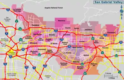 The San Gabriel Valley in Southern California is a region of Los Angeles County. Stretching from Pasadena to Pomona at the foothills of the San Gabriel Mountains to the north, the valley encompasses numerous suburban communities to the northeast of Downtown Los Angeles.