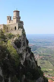 - 🌍 La Terrazza, Contrada del Collegio, 31, ☏ +378 0549 991007. Daily 12:00-14:30, 19:00-22:00. A restaurant that is part of Hotel Titano which overlooks the slopes of the city, valleys, and countryside surrounding the City of San Marino. Views of the central Piazza della Libertà are also available to the other side of the dining room. Eat their homemade pasta. Pasta €13 (Feb 2020).