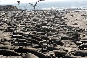 - 🌍 Piedras Blancas State Marine Reserve, Highway One (north of San Simeon). In 1990 approximately two dozen elephant seals showed up at the beach at Piedras Blancas; in 2014 that number was over 20,000 and nearly 5,000 pups were born. Large males measure 14-16 feet long and weigh 3,000-5,000 pounds. Adult females measure 9-12 feet long and weigh 900-1,800 pounds. Pups are 3-4 feet long and weigh 60-80 pounds when born. Big males arrive to stake out territory in late-November, females arrive in mid-December, and most pups are born between mid-December and early February. By March the adult seals will return to the ocean, leaving the pups to teach themselves to swim. From April through August molting seals can be seen on the shore, while in September and October only a handful of resting seals visit the beach. A viewpoint along the highway provides parking, an overlook, and information about the seals. Docents may be on hand to provide additional information.