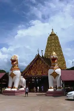 • Wat Wang Wiwekaram and Chedi Buddhakhaya - Walk over the bridge to the Mon village, and bear left parallel to the lake. After 2 km the concrete road forks. Left goes to the huge golden chedi, with a small Burmese goods market below it, and right goes to the main Wat Wang Wiwekaram. The wat was built by the late Phara Uttama, who was one of the most important monks in Thailand, and is still highly revered in the Mon community. There is a large, ornate viharn at the main wat, and in another building there are murals depicting stages of the Buddha's last, and previous, lives. You may wish to hire a taxi as it's quite a long walk and it is easy to get lost in Wangka village (although people are happy to point you in the right direction).