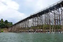 • Saphan Mon (สะพานมอญ) - The 400 m wooden bridge (other sources claim it's 800 meters long) has been there since the mid 80s. It's the longest wooden bridge in Thailand and was destroyed in July 2013 but fully repaired. There is a small cafe on one end which is a great spot for a drink and a view. Donation boxes at either end help with maintenance for the bridge; donate and you will also receive a great photo in return. Local kids like to jump off the bridge into the lake.