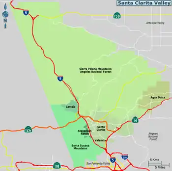 - 🌍 Santa Clarita — The primary city of the valley, home to most of its dining and lodging options as well as the shopping of the upscale Valencia Town Center mall.